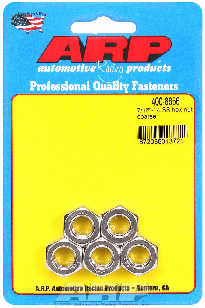 To compliment ARP “bulk” 5-pack chrome moly and stainless steel fasteners we have assembled matching groups of nuts. They, too, come in convenient 5-pack skin cards. Take your pick from stainless steel and black oxide finished standard nuts or stainless steel Nyloc and cad plated Nyloc self-locking nuts.